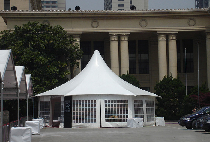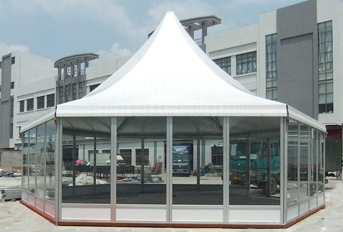 多邊形尖頂篷房種類(lèi)豐富,如六邊形篷房、八邊形篷房、十邊形篷房、十二邊形篷房甚至更多邊數的尖頂篷房。所謂的六邊形尖頂篷房就是在六邊形的基礎上將篷頂變成尖頂的樣式,使篷房造型更加美觀(guān)。