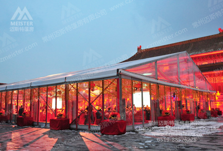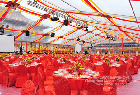 邁斯特篷房廠(chǎng)家專(zhuān)業(yè)生產(chǎn)各種婚禮慶典篷房,跨度從3-50米不等,提供的選擇較多。而從外觀(guān)方面也有多種選擇:人字頂篷房、歐式尖頂篷房等等。篷布可以選用白色、紅色或透明,也可以選擇玻璃幕墻等硬體墻,使整個(gè)婚禮慶典更加高大上。