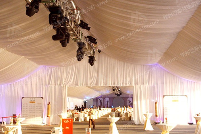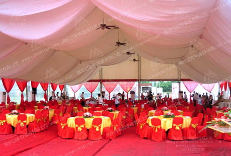 在配套設施方面,邁斯特廠家提供雙面涂層PVC篷布(白色或紅色),玻璃幕墻,布幔、舞臺、燈光、桌椅等,能夠讓您在篷房內(nèi)就能得到酒店般的體驗。這是一款跨度15米的婚慶篷房,具有完善的配套設施,為賓客們提供一場難忘的婚禮宴會。